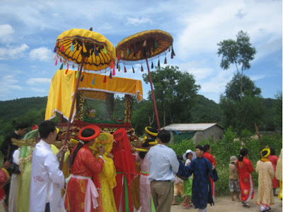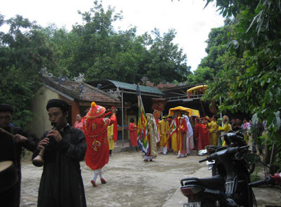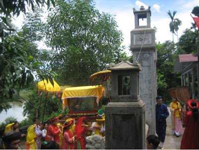 - 13giờ 30 dân làng với cờ lọng, chiêng trống lễ nhạc, tín hữu kế thừa… đến đền cách đình làng chừng 500 mét cung nghinh linh vị thánh mẫu về đình.