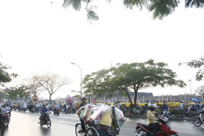 Tết đã về vì hai lề đường quán xá dọc Bao Vinh đầy ắp hoa giả hoa thật, bánh trái đủ màu, đủ xứ ai cũng muốn chồm ra đường. Đường thì hẹp xe thì đông: xe đạp, honda, xích lô, taxi… người chen qua đường vô tội vạ nên kẹt xe, kẹt người, tiếng còi xe, tiếng rủa thầm… cái tết thúc sau lưng nên chẳng ai nhường nhịn ai…